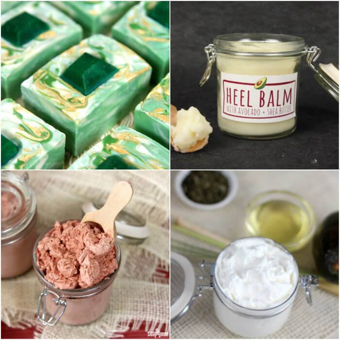 Top left, clockwise: Emerald Swirl Cold Process Tutorial, Moisturizing Heel Balm, How to Make Whipped Body Butter on Soap Queen TV, Whipped Amber Bronzing Butter