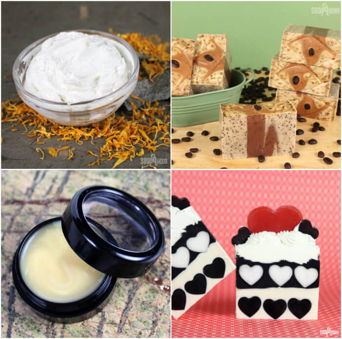 Top left, clockwise: Bramble Baby Belly Butter, Espresso Shot Cold Process Tutorial, Queen of Hearts Cold Process Soap, Vanilla Latte Lip Balm