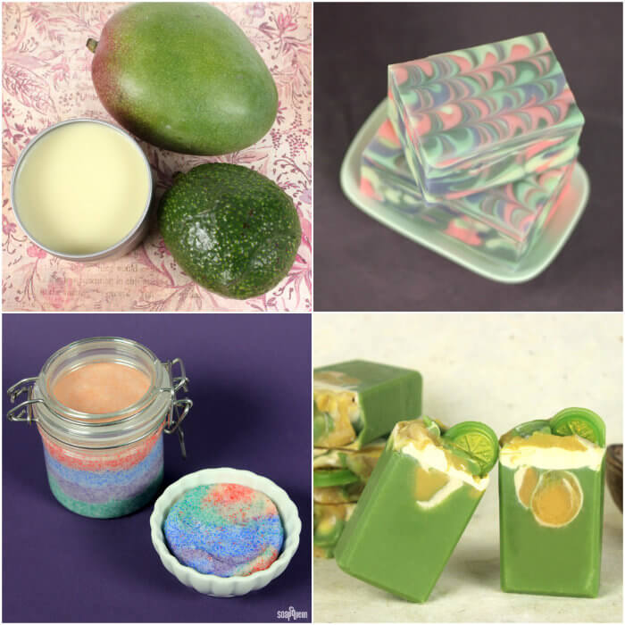 Top left, clockwise: Mango Avocado Balmy Salve, Butterfly Swirl Soap Tutorial, Lime in the Coconut Milk Cold Process Tutorial, Rainbow Jojoba Bead Sugar Scrub