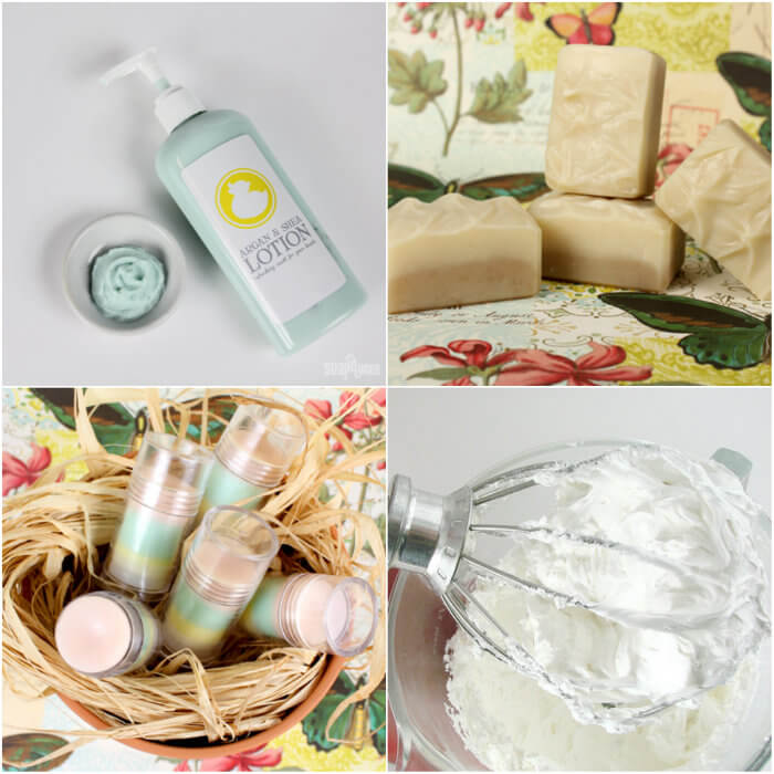 Top left, clockwise: Argan & Shea Lotion, Loofah Cold Process Soap Tutorial, Easy Whipped Shea Butter, Lotion Bar Love