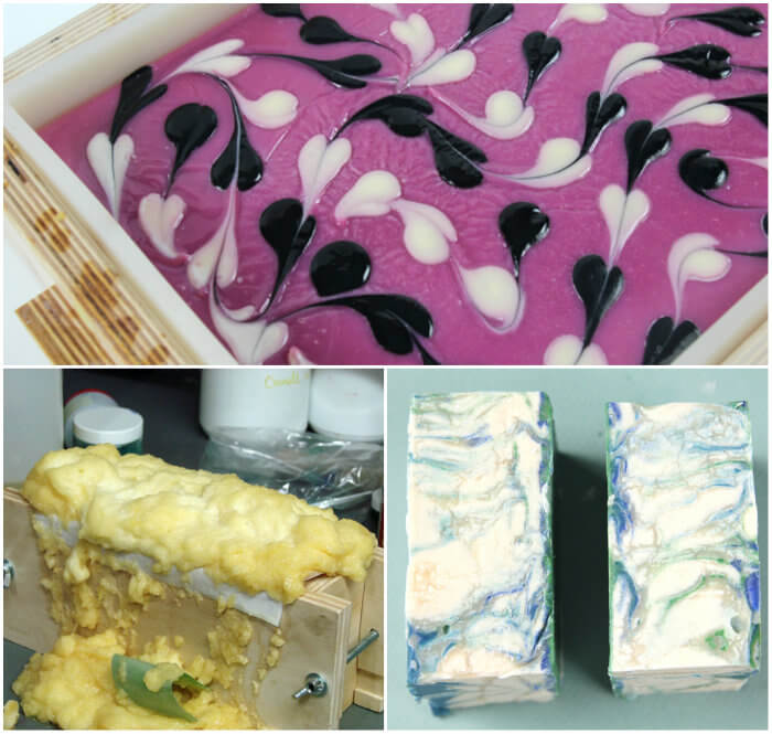 On the bottom left is a soap volcano. This soap overheated due to a combination of hot oils, coconut milk and a untested fragrance oil. Click here to read more about this incident. Luckily I was able to save this batch by using the hot process hero method. On the bottom right is an example of glycerin rivers. When cold process soap gets too hot the naturally occurring glycerin within the soap can congeal, becoming more apparent and visible, forming the “rivers.” Click here to learn more about glycerin rivers and how to prevent them.