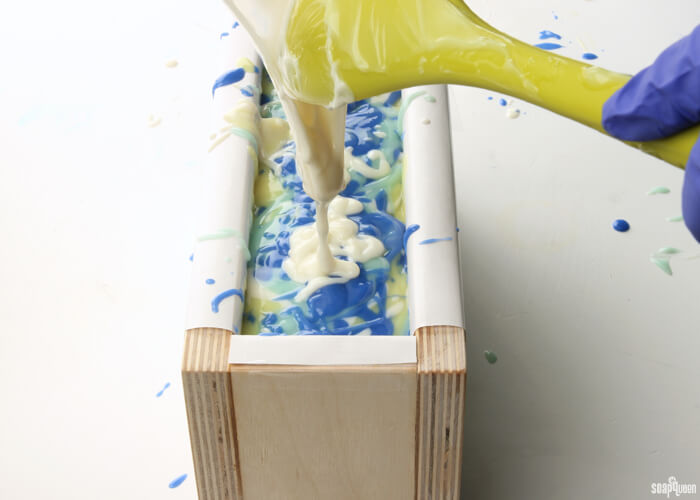 A wood mold is used in the Blue Rain Drop Swirl Cold Process to insulate the soap. Don’t forget to line your wood molds!