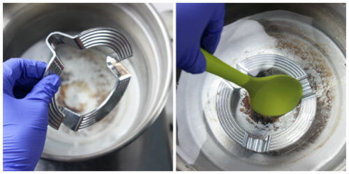 First, fill up a pot of water large enough to accommodate the bag of oils so the sides don’t touch the pot. Place a Double Boiler Maker at the bottom of the pot and center using a spatula. Using a Double Boiler Maker prevents the bag from coming into direct contact with the bottom of the pan, which can become extremely hot. While the bags can withstand high heat, the bottom of the pan can melt the plastic. The Double Boiler Maker keeps the bag from coming in contact with the bottom of the pan, so it won’t melt.