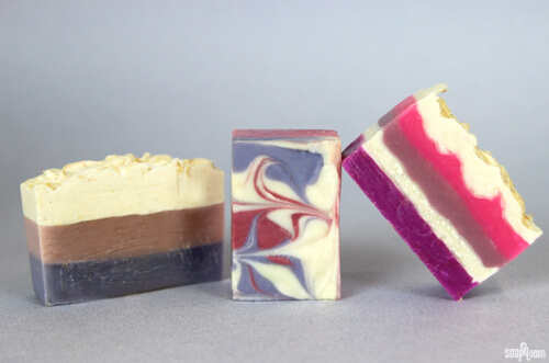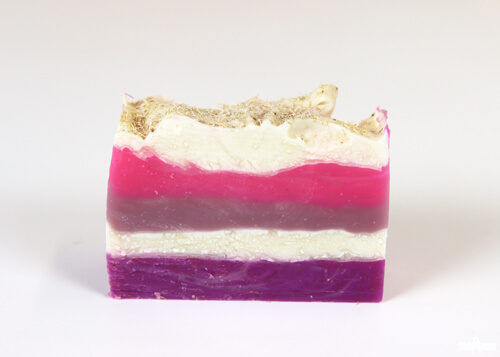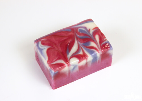 While this soap did not contain drag marks from the loofah, the pink was a little more red than planned. While the swirl looked great, swirling with the Lilac Fragrance Oil was tricky. I wanted the Layered Lilac Loofah Tutorial to be successful for as many soapers as possible, so the swirls had to go.