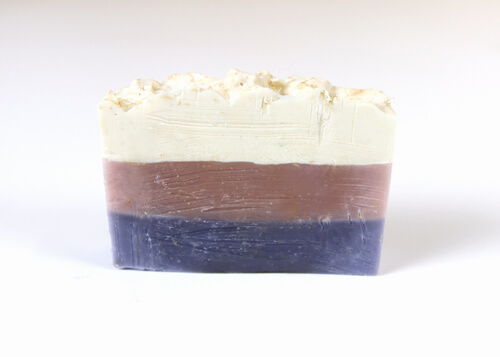 Creating layers with the Lilac Fragrance Oil was easy, and the soaping process went smoothly. Shredded loofah went into the bottom two layers and on top. Once removed from the mold and cut, the colors did not pop quite like I wanted them to. Also, the shredded loofah in the bottom two layers created substantial drag marks throughout the soap. While drag marks are perfectly fine, aesthetically I wanted to avoid them.
