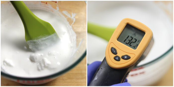 If your container of liquid melt and pour contains chunks, be careful not to over-microwave and burn the melted soap. Remove the bowl from the microwave and stir for 30-60 seconds to allow the hot liquid soap to melt the chunks. Place the container back into the microwave and use small bursts of heat. Continue to stir between each burst until all the chunks are melted. Below, you can see a bowl of melted soap that still has large chunks. But, it is already at 132.2 ° F…more microwaving could cause the soap to burn. Time to stir, stir, stir and melt in 10 second bursts between each stir. If the chunks of melt and pour are really large, remove them from the mixture and melt separately.