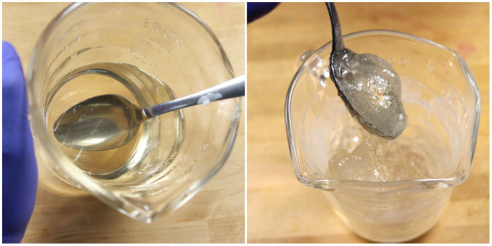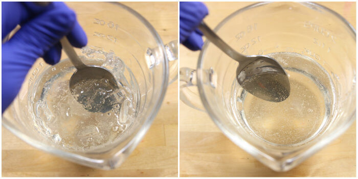 In the photos below, the soap reached temperatures of over 200 ° F. You may notice the color has a slight yellow tint in the photo on the left. It did not smell very good, and there was a lot of steam coming off the soap. While unpleasant to smell, the soap was still liquid and workable. On the right, the soap has cooled to about 150 ° F. At this temperature, unburned melt and pour would be fluid. But, because this soap was burned so badly, the soap has become a thick, jello-like consistency even at 140 ° F.