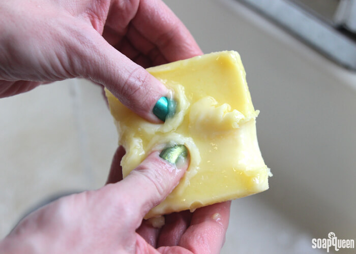 Bottom left: After sitting in the mold, the jojoba oil separated. Right: Once removed, the solid part of the bar was extremely soft after 6 weeks.Â