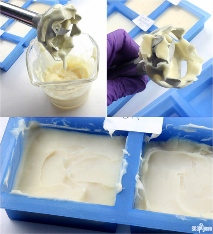 Top: Jojoba oil took quite a bit of stick blending in order to emulsify the oil and lye solution to trace.
