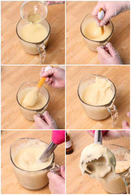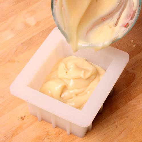 Note: Although we stick blended the batter for the purpose of experimentation, we generally do not recommend stick blending fragrances into your soap batter. It can cause even the most well-behaved fragrance oils to accelerate or seize up.