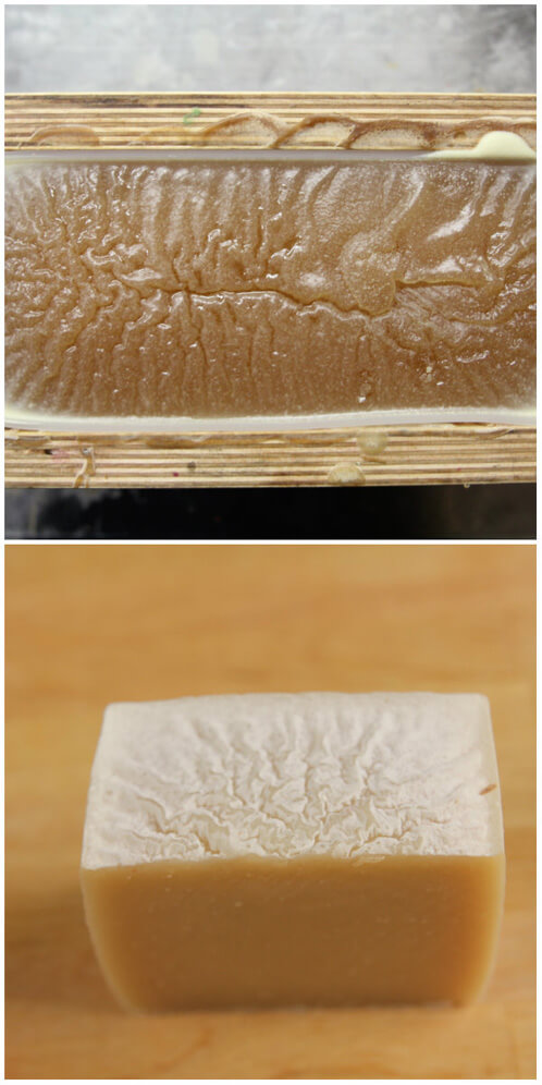 In other instances though, the sugars can super-heat the batter so much that it causes the soap to overflow out of a mold into a soapy lava flow. That’s what happened to this coconut milk soap: