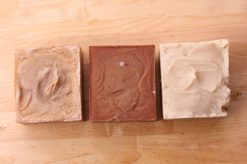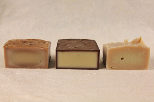 Just for fun, we cut into each soap. Exhibit A went through gel phase in the center (notice that dark, oval circle) as well as discoloration from vanilla content in the fragrance oil. Exhibit B went through textbook vanilla discoloration, showing the dark brown on the outside and creamy white in the center. Exhibit C was so thick when it was poured that there were bubbles throughout — notice the small hole where an air bubble was trapped.