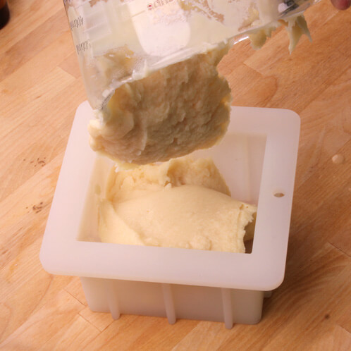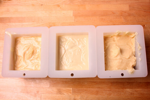 Acceleration occurs when a fragrance oil brings the batter to trace extremely quickly — sometimes too quickly to work with! In the case above, the fragrance oil thickened the batter to the consistency of pudding almost immediately after being mixed in with a spoon (notice the top right photo). Just to see how thick we could get it, we took a stick blender to it to see if it would seize, which is a more advanced form of acceleration. Seized soap is the more like the texture of Play-Doh or clay, and at that point it’s almost impossible to pour into a mold or work with at all. In this case, the fragrance got fairly thick, but we still managed to glop it into the mold. If you have a seizing or accelerating fragrance, just get that batch into the mold as quickly as you can. Be prepared for it to heat up quickly. Often there is a correlation between the acceleration/seizing and excessive, quick heat in your soap batch. On to the next one!