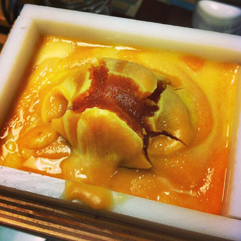 Soap Volcano: Natural sugars (including fruit purees) and alcohol in cold process soap can super heat the soap and cause what’s known as a soap volcano. This soap had pumpkin puree in it, and the mini soapy eruption was relatively mild. Once unmolded,we simply cut a few inches off the end and the soap was perfect.