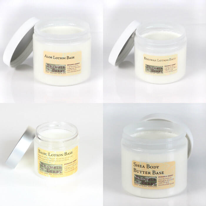 Which base is right for you? First, consider the texture. If you’re looking for a rich thick product, the Shea Body Butter Base or Beeswax Lotion are good options. If you prefer a thinner texture, the Basic Lotion Base or the Aloe Lotion Base have a lighter feel. Keep in mind that the texture may also affect how you package your product; thicker lotions are best in a jar or squeeze bottle, while thinner products can be put into a pump style bottle.