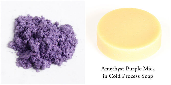 Mica colorants can be used in a wide variety of projects. Unfortunately, most micas morph in cold process soap. For example, Amethyst Purple Mica looks beautiful in melt and pour, but nearly disappears in cold process. Just check out the photo below! Typically, whether or not a mica works in cold process depends on what type of colorant is used to dye the mica. We recommend doing a small test batch to make sure the color is stable in your particular recipe. Morphing is not always a bad thing. Sometimes a mica can morph into a shade that’s still beautiful! For example, Coral Mica results in a soft peach color in cold process, while Cellini Blue Mica turns into a lovely lavender tone.