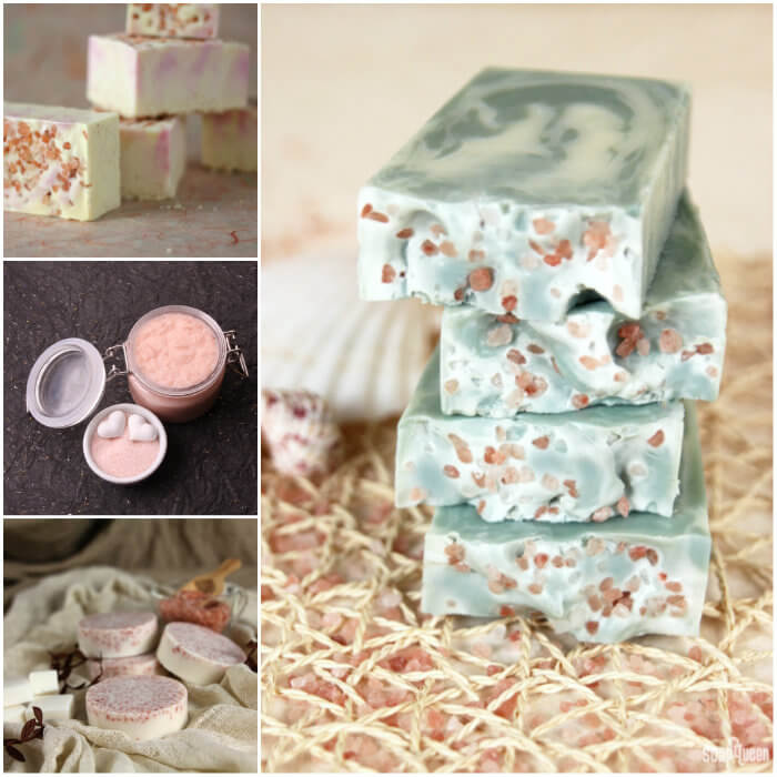 sea saltcollageTop left to right, clockwise: Pretty in Pink: Salty Cold Process, Sea Clay Swirl Cold Process, Pink Salt and Shea Bath Bar, Pink Salt Foot Scrub