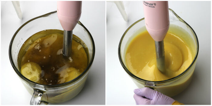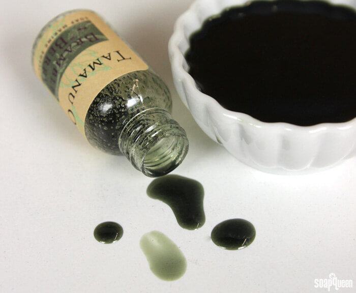 In cold process soap, we recommend using it at 5% or below. Because of the rich dark color, it may have an effect on the color of your final product, depending on how much you use. In the photos below, the recipe contains 5% tamanu oil. Notice the bright yellow color that the oil makes! The yellow color could be combated by using titanium dioxide, but you may want to avoid cool tones when using tamanu oil in cold process soap.
