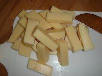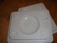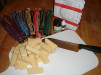 Here is the entire set up: Soap Ropes, Fragrance, Labcolors (water soluble and easy to mix in), the assembled soap mold, a sharp knife, a cutting block and my chopped up goat milk soap. Check back tomorrow for tips on melting, pouring, and fill line tricks as well as a contest (with prizes!).