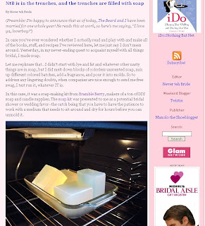 THE VERDICT: I’ve never poured soap before, but it was definitely easy. All told, I probably spent about two hours on the whole project. At $31.55 (plus the cost of a little organza for wrapping) for forty favors, the price is right. You could, however, buy the bits individually to customize your soap. There’s hemp soap and goatsmilk soap and all manner of nice adds. In conclusion, I could see this being a fun weekend DIY fest for a bride and her ‘maids.
