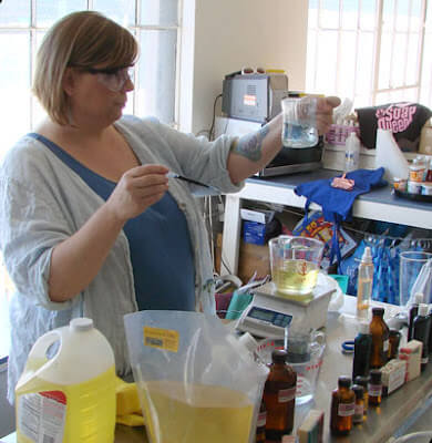 The second day of the Soap Intensive Weekend is over and we are all leaving tired but enriched. Some of the comments after the weekend were, “I learned so much, my head is spinning. And, that’s in a good way” and “I would recommend that anyone interested in soap and starting a business come here first.”