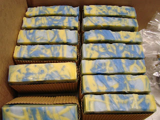 Don’t they look adorable, all lined up and ready to ship? Kudos to Erik at Otion for making these artistic, triple-swirled soaps.