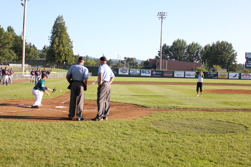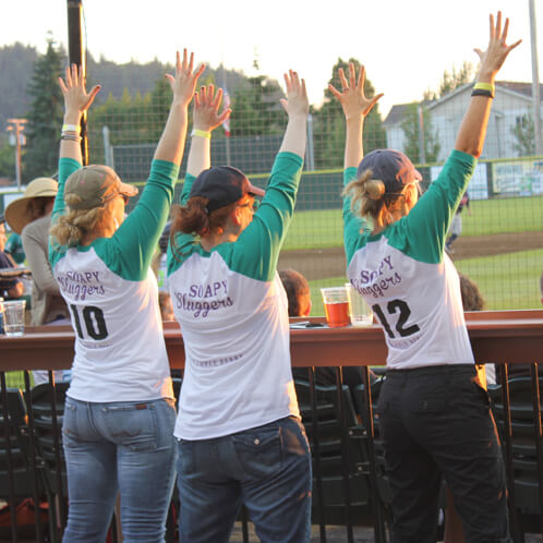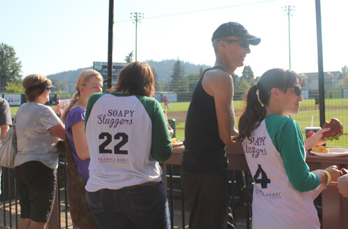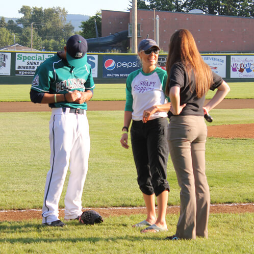 The Bellingham Bells are a team of collegiate-level players who participate in the West Cost League. They play during summer break from school, and travel from all over the west coast to compete. We were lucky enough to catch a game between the Bells and the Kelowna Falcons in a battle for the first place slot in the league! The Bells took the game, and I’m sure it was due to Team Bramble Berry’s well-established enthusiasm and cheering abilities. Those big lungs and big hearts were comforting when I was asked to throw out the first pitch (!) and Rachel and Carla from customer service were brought onto the field between the first and second innings to participate in a fun game of (GIANT) dice throwing! Get ready for a picture-heavy post…