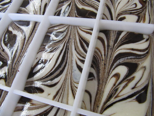 Our favorite was definitely the swirled cold process soap. We loved the natural chocolate coloring in the soap and used a heavily colored titanium dioxide white soap to provide contrast to the textured, dark soap.
