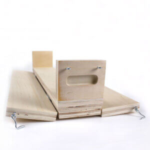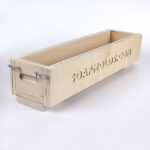 ELF Wooden Soap Mold – Made by our brother company company, ELF Industrial (www.soapmolds.com), this log mold is made out of ¾” Unfinished Birch Wood and features a hook and eye latching system for years of use. As with all wood molds, you should always line the mold with plastic or butcher paper for each use. Final Soap Log Dimensions: 2 3/4″ x 3 1/2″ x 17 1/2″.