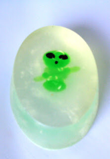 Isn’t it fun that you can put almost anything in soap? Check out the indie chic, rebel gun barrel and alien toy she used in the Clear Melt & Pour. It’s a lovely bonus to work with people who are creative and love our products enough to make goodies at home when they’re not at work.