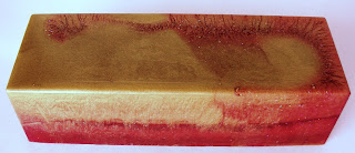 Johanna in Customer Service never stops coming up with cool soaps. In this one, she tested out our new 3 lb loaf flexible mold. She used Clear Melt & Pour with Lychee Red Tea and Kumquat fragrance oils. For color, she used Heavy Metal Gold Mica and the Santa Red Labcolor. To get the interesting swirl, Johanna did a little experiment. She poured in both colors at the same time but from opposite ends. It turned out unique and different looking. We’re all excited to see what it looks like once the loaf is cut.