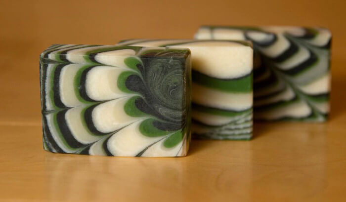 Molly’s soaping style is full of striking contrast from a green, white and black color palette. The design reminds me of a spring flower. To get a similar look, click through the Havana Classic: Neptune Column Pour Tutorial. You can also get a similar design with the Funnel Pour Soap Technique on Soap Queen TV.