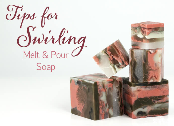 Another technique you can use in melt and pour soap is swirling. Temperature is important when swirling melt and pour. If the temperatures are too hot, your colors will mix together instead of swirling. It also helps to pour the melted soap from different heights and areas of the mold to get an interesting look. Learn more in the Tips for Swirling Melt & Pour post.