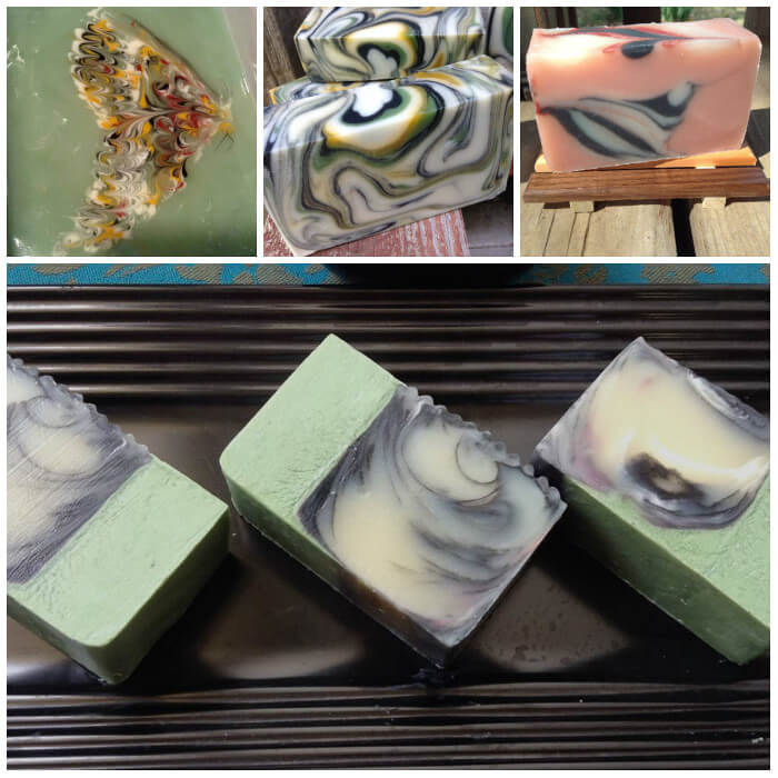 collageAbove (clockwise, top left) are Sara’s butterfly soap, Neroli Soap, Lychee and Red Tea Soap and green swirled soap. If you love the vertical layers in Sara’s green soap, check out the Infinity Swirl Soap video on Soap Queen TV. For a layered melt and pour look, click through the Minty Clay Melt and Pour Tutorial.