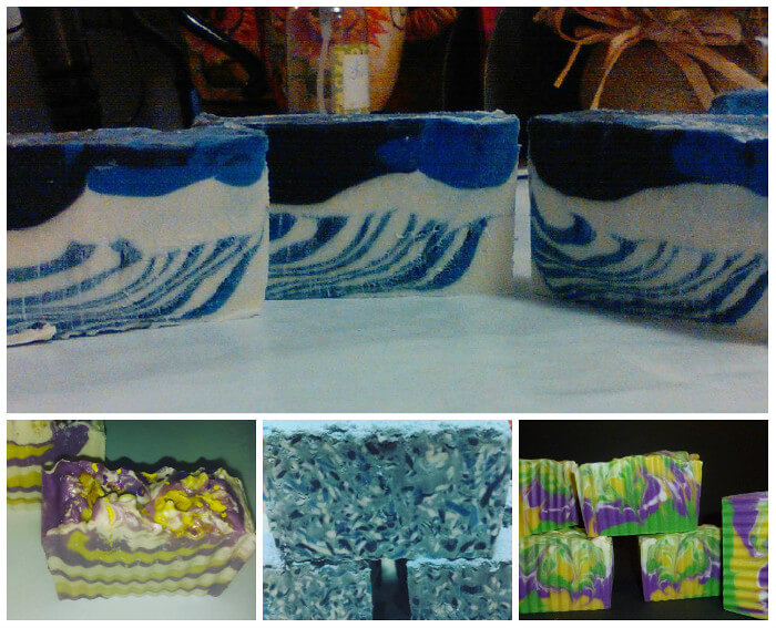 Above (clockwise, top) are Omneya’s blue and black soap, green and purple soap, rebatch soap and purple and yellow soap. For more creative rebatch ideas, click through the Holiday Candy Rebatch Tutorial. The Ombre Rebatch Layers Soap has lovely shades of pink.