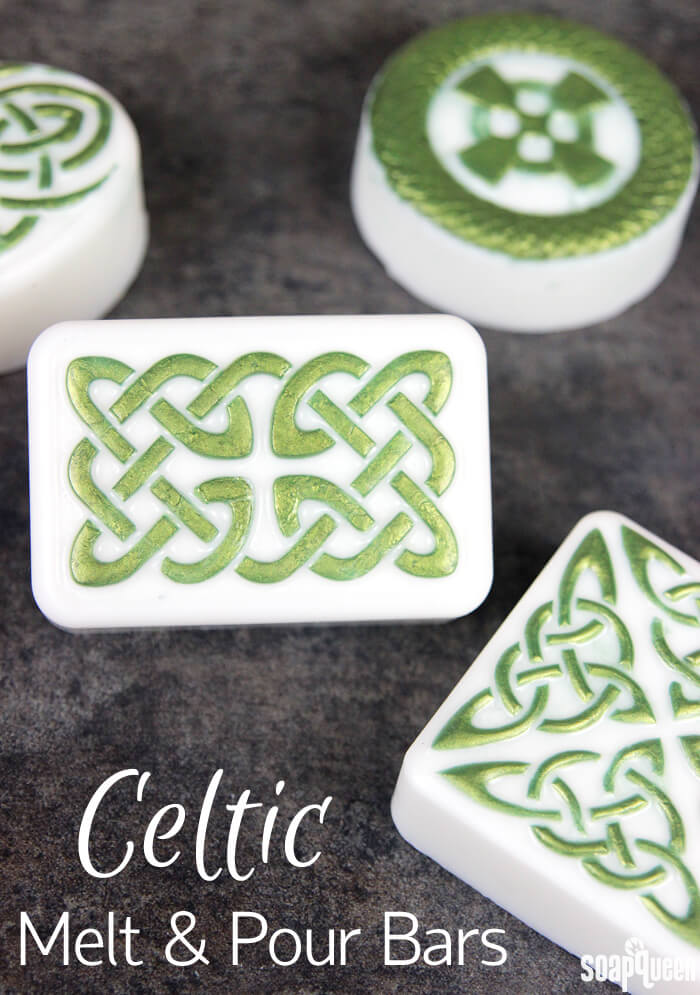 This week featured plenty of green and gold inspiration for St. Patrick’s Day. The Celtic Melt and Pour Soap is made with Evergreen Mica. The shimmery evergreen soap is piped into the details of the Celtic Combo Limited Edition Mold for a festive look. To go with the green theme, the soap is scented with Green Tea and Cucumber Fragrance Oil. It’s perfect for St. Patrick’s Day gifts or party favors.
