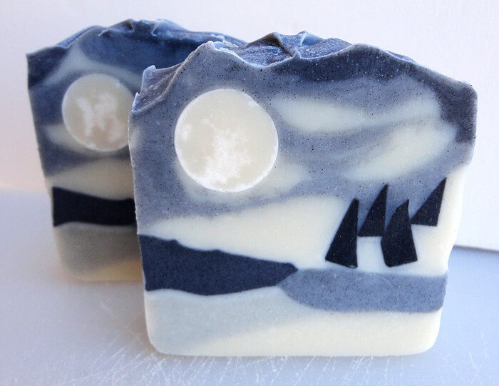 The Winter Moon Soap is unique and breathtaking. It was made for this month’s Great Cakes Soapworks Challenge. One of my favorite parts is the moon – I love the dimension it has. The night sky and snowy hills are excellent as well. To learn how to make a landscape soap, click through the Alpine Adventures Cold Process Tutorial. The Stormy Seas Cold Process Soap was inspired by the cold winter months.