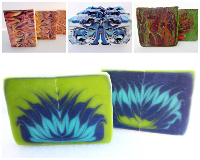 Above (clockwise, top left) are Gingerleaf’s Helix Swirl Soap, Butterfly Garden Soap, Clyde Slide Soap and Circling Taiwan Swirl Soap. For more butterfly swirl tutorials, check out the Monarch Butterfly Swirl Cold Process Tutorial. Love their Clyde Slide soap? The Galaxy Clyde Slide Cold Process Tutorial shows you how to get the look.