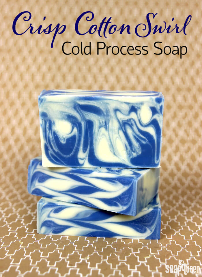 The 10″ Silicone Loaf Mold was also used in the Crisp Cotton Swirl Cold Process Soap. That tutorial focuses on how to swirl soap. Thin to medium trace soap is needed to make defined swirls that aren’t muddled. Once the soap is swirled in the mold, the Hanger Swirl Tool adds more interest. Crisp Cotton Fragrance Oil is used in the recipe because it doesn’t accelerate, and it complements the blue and white color palette.