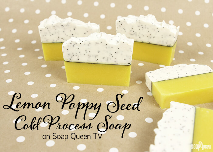 Another way to add scrubbiness to your bath and beauty products is poppy seeds. They add exfoliation and a pop of color to the Lemon Poppy Seed Cold Process on Soap Queen TV. The soap features a bright yellow bottom layer, a mica vein and a white top layer with poppy seeds. The soap gets its fresh and bubbly scent from Lemon Verbena Yankee Type and Champagne fragrance oils.