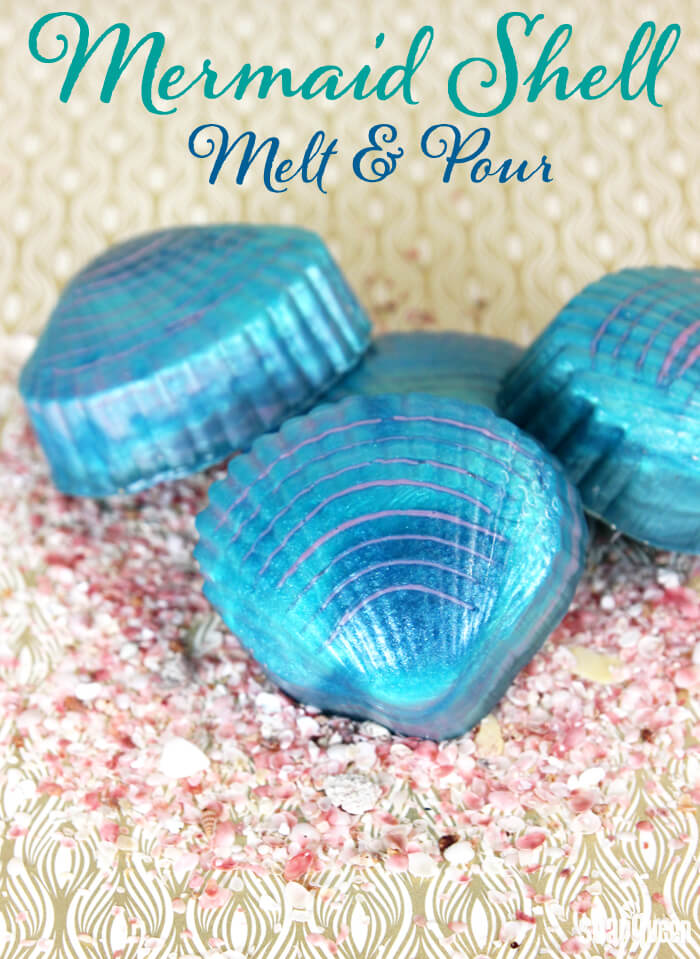 A combination of Cellini Blue Mica and Gold Sparkle Mica create a sea-inspired blue that makes the Mermaid Shell Melt and Pour Soaps stand out. To get a realistic clam shell look, several thin layers of soap are poured into the mold and a fork is used to create texture. The soap is finished with a fresh smell from Crisp Cotton Fragrance Oil.