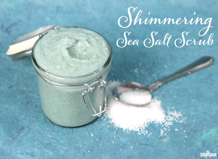 Gold is also used in the Shimmering Sea Salt Scrub. Blue Mix LabColor and Emerald LabColor make an aqua color, and Gold (light) Mica adds a bit of shimmer. To exfoliate your skin, the scrub has dead sea salt. The scrub also moisturizes with a combination of shea butter and coconut oil.