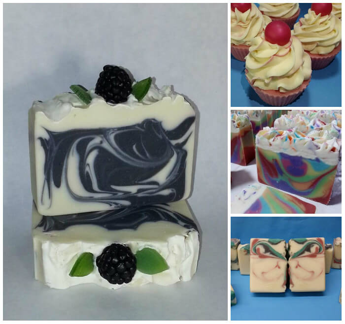 Above (clockwise, left) are Majorie’s Berrylicious Soap, Strawberry and Lemon Cupcakes, rainbow soap and Black Raspberry Vanilla Soap. If you love rainbow soap, check out the Over the Rainbow Cold Process Tutorial. Rainbow colors look great in melt and pour too, as seen in the Rainbow Hearts Melt and Pour on Soap Queen TV.