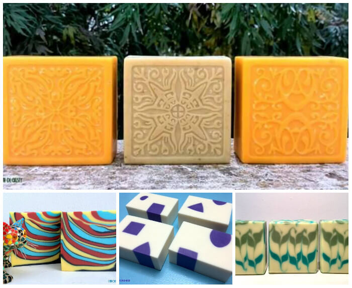 Above (clockwise, top) are Guistiniano’s orange and tan soap, hanger swirl soap, purple and white soap and layered soap. If you love the bright layers in Giustiniano’s soap, click through the Honey Bee Funnel Pour Cold Process Tutorial. Get the look without a funnel in the Faux Funnel Pour Tutorial.