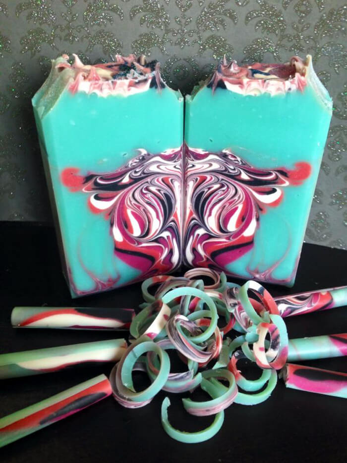 The colors in Carolyn’s soap are absolutely gorgeous. The blue base perfectly complements the pink, white, orange and black colors in the middle. If you want to learn how to do the hanger technique used in Carolyn’s soap, click through the Once Upon a Dream Cold Process Tutorial. The technique also looks great in the Tiger Stripe Hanger Swirl Tutorial.
