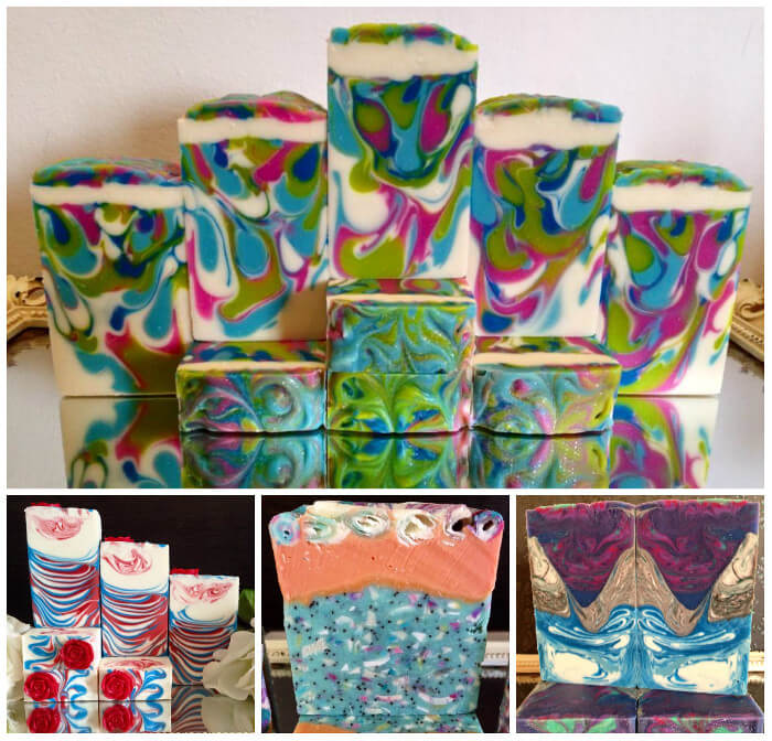 Above (clockwise, top) are Carolyn’s Rio de Janeiro Soap, Norway Soap, Recycled Soap and Paris Soap. Soap scraps add a unique look to your soap, as seen in the Cherry Blossom Glitter Cold Process Tutorial. Find more ideas for your extra soap in the How to Use Leftover Soap Scraps post.