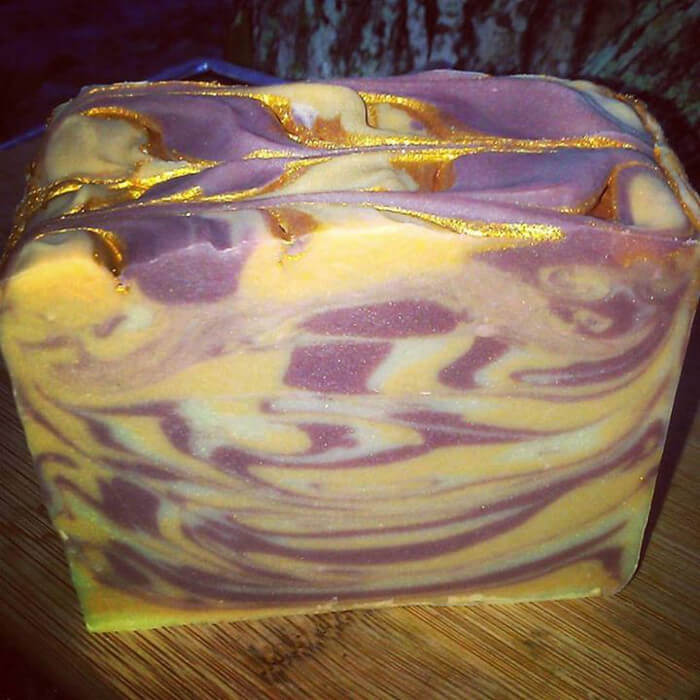 There are so many beautiful details in Jenn’s soap. The yellow, purple and white swirl look amazing with the shimmery gold mica painting on top. For more swirly soap, click through the Emerald Swirl Cold Process Tutorial. The Ginger Patchouli Melt and Pour Bars Tutorial shows you how to get swirls in melt and pour soap.
