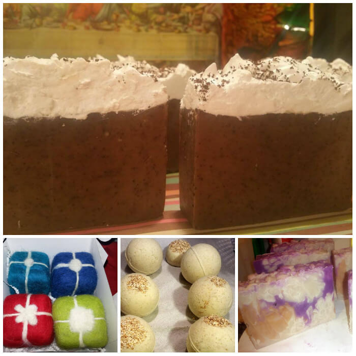 Above (clockwise, top) are Aileen’s coffee soap, swirly soap, bath bombs and Soap Petit Fours. If you love Eileen’s felted soap presents, check out the Melt and Pour Soap Ribbons Tutorial. For more creative ribbon ideas, click through the Holiday Ribbon Candy Melt and Pour Tutorial.