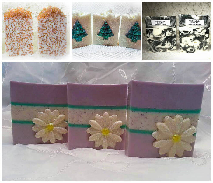 Above (clockwise, top left) are Katherine’s Vanilla Honey Soap, Frosted Pine Soap, Scottish Rain Soap and Garden Mint Soap. If you love the look of the Vanilla Honey Soap, you’ll love the Green Meadow Melt and Pour Bars. Soap scraps look great in cold process as well, as seen in the Cherry Blossom Glitter Cold Process Tutorial.
