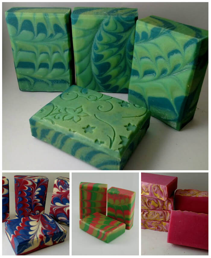 Above (clockwise, top) are Delinda’s Cucumber Melon Goat Milk Soap, Seduction Goat Milk Soap, Watermelon Crawl Goat Milk and Aloe Soap and Stars and Stripes Goat Milk Soap. The mica painting on Delinda’s Seduction soap really stands out. Learn more about mica painting in this post. The technique adds shimmer and interest to the Gold Mine Cold Process Soap Tutorial.